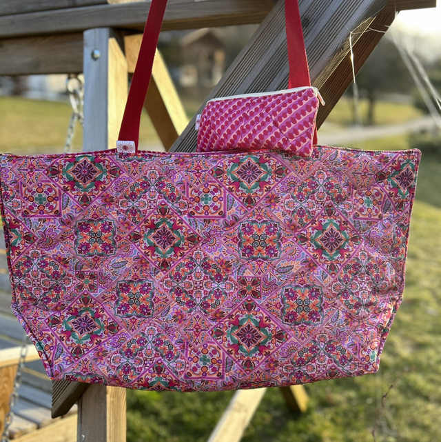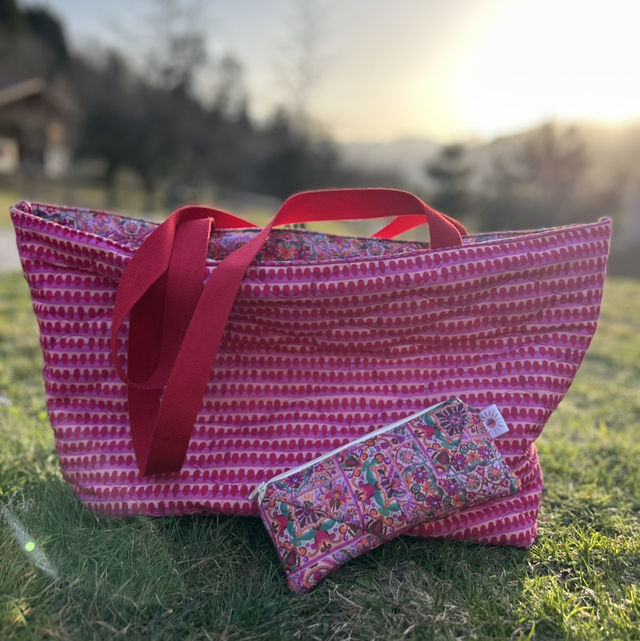 Le sac de plage XXL réversible et sa trousse en tissu matelassé