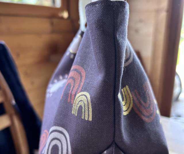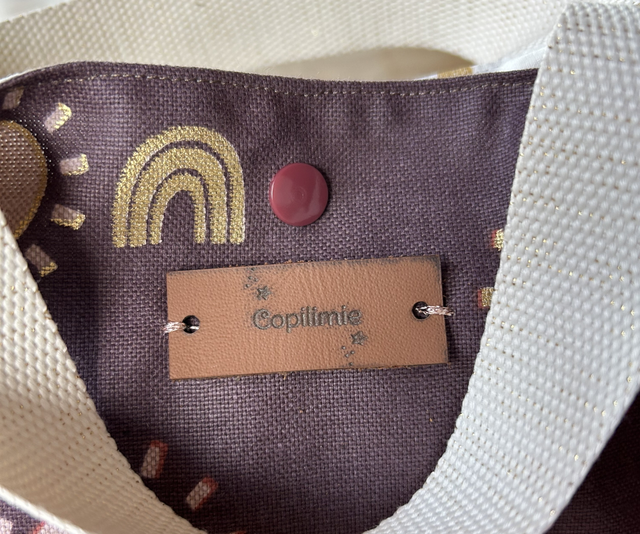 Ce sac cousu façon origami est composé d’un tissu crétonne à l’intérieur et d’une toile irisée aux motifs arcs en ciel et soleils.